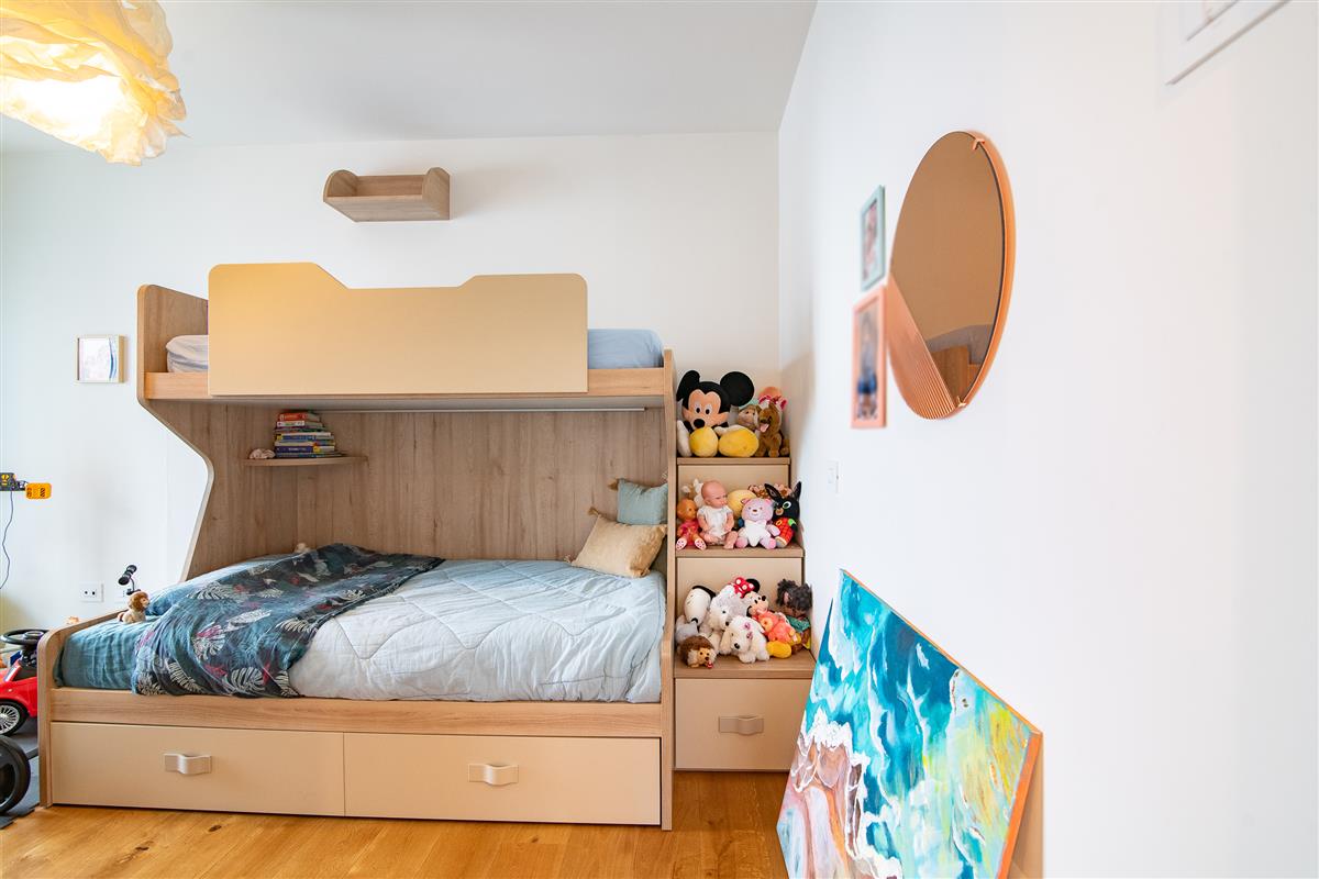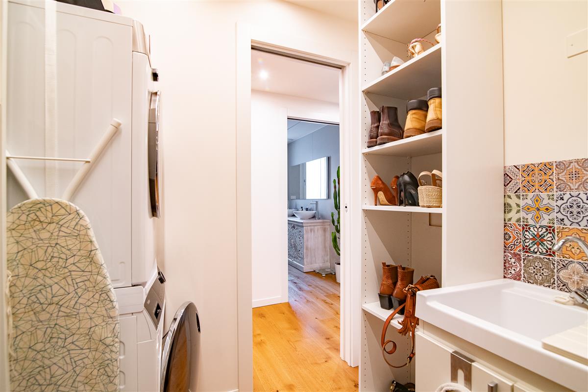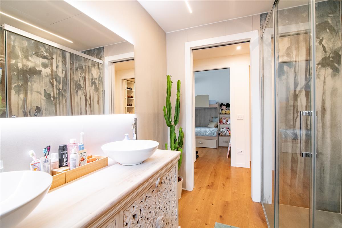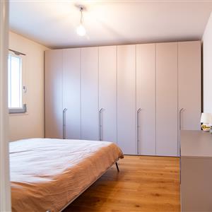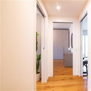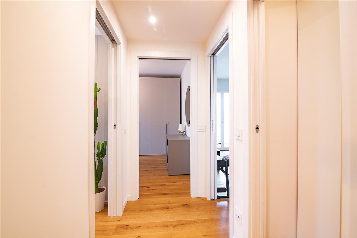 L' immobile, posto ad un secondo piano con ascensore, si compone di un ingresso con cucina a vista che affacciano su un ampio terrazzo coperto, da un disimpegno che accompagna alla zona notte e permette di accedere a due comode camere da letto, un bagno finestrato con doccia ed un locale di ampia metratura utilizzato come cabina armadio, dotato di tutte le predisposizioni per essere trasformato in un secondo bagno completo, così come da progetto iniziale.