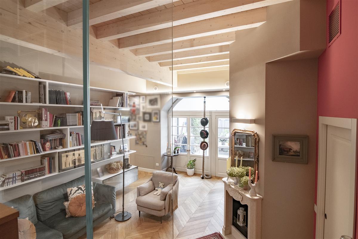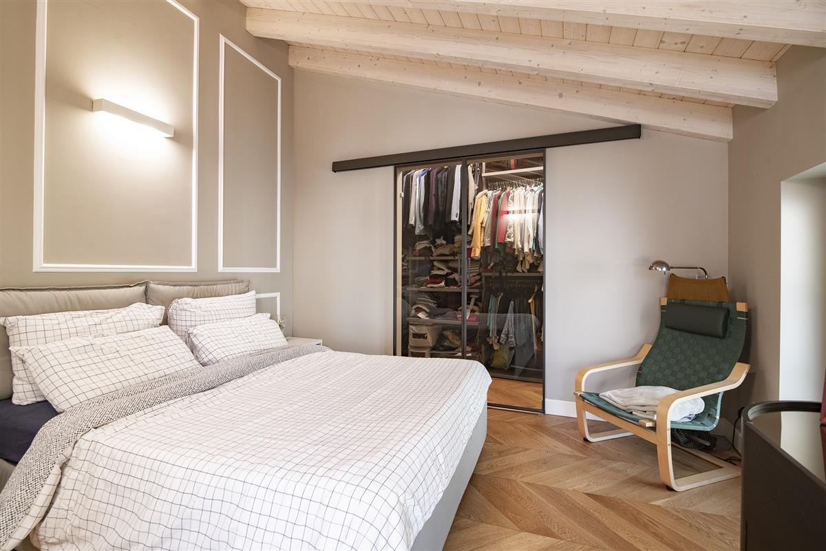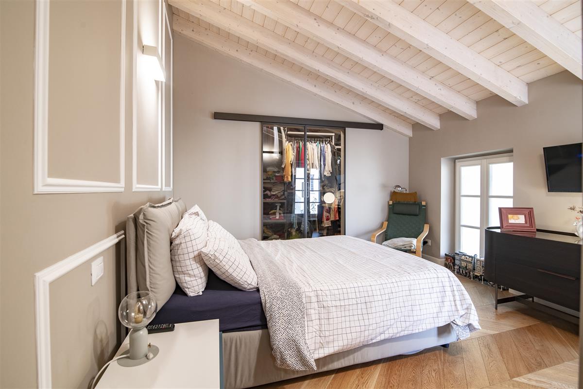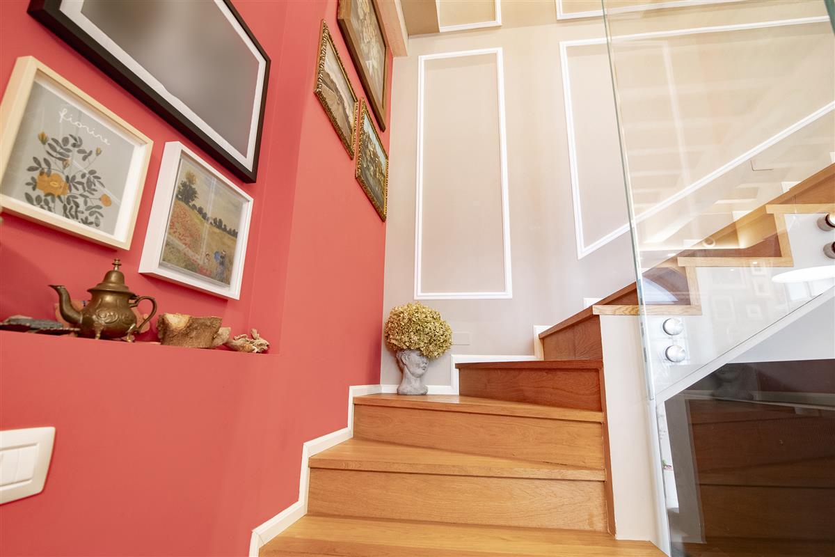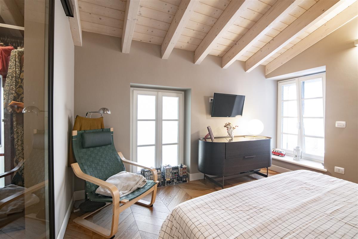 Salendo al piano primo, attraverso una scala con vetrate a tutta altezza, si trova la camera padronale di ampia metratura con cabina armadio, un bagno finestrato con vasca da bagno free standing, una cameretta attualmente adibita a studio, una camera matrimoniale facilmente soppalcabile per ricavare ulteriore superficie.