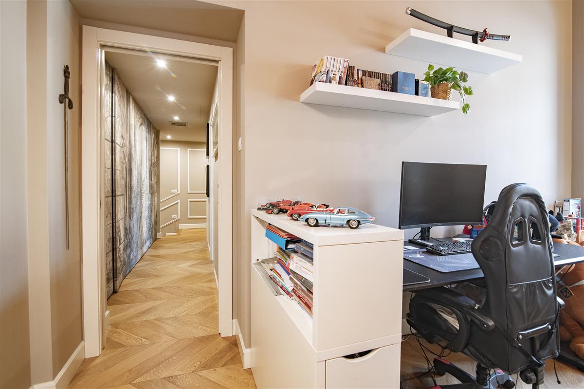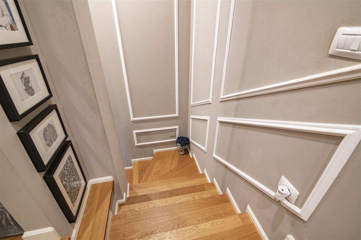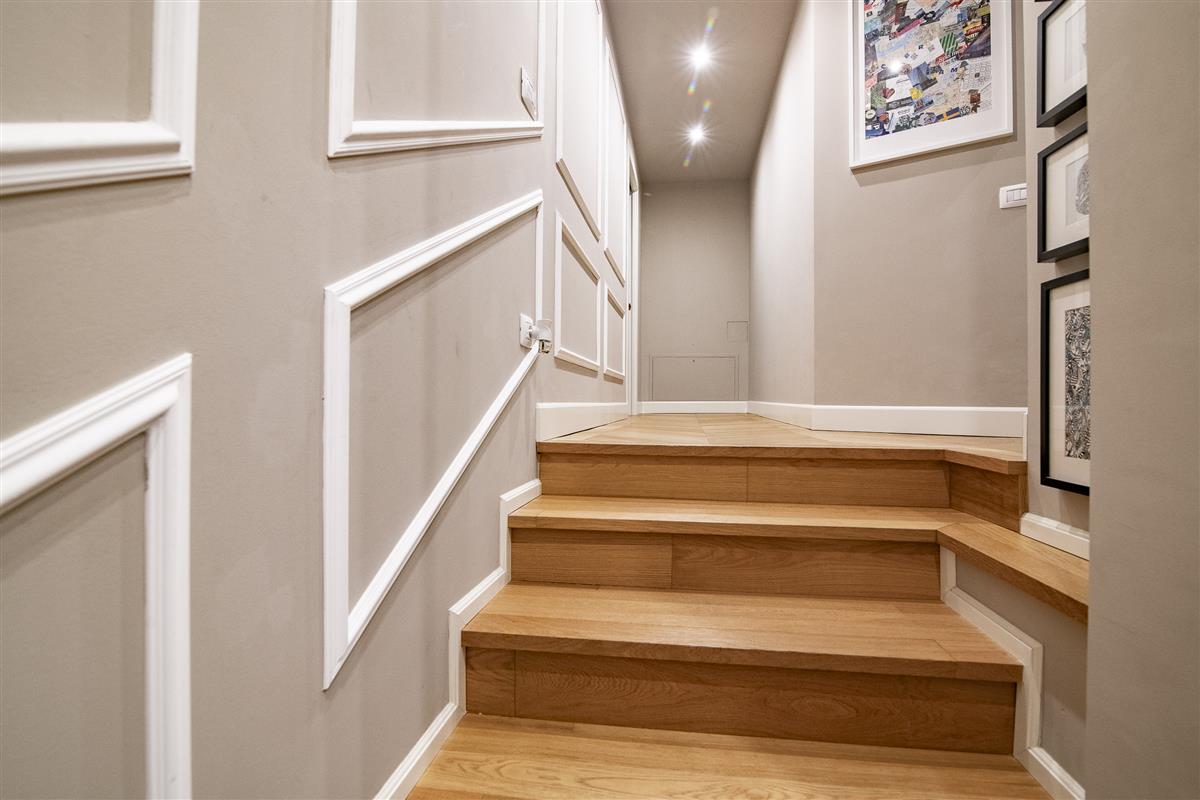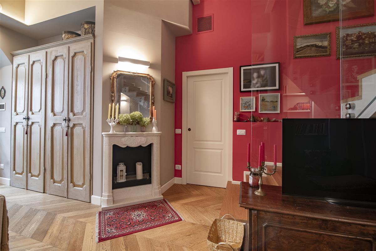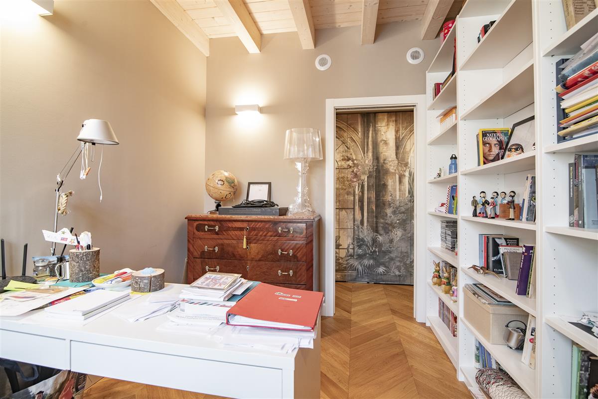 Salendo al piano primo, attraverso una scala con vetrate a tutta altezza, si trova la camera padronale di ampia metratura con cabina armadio, un bagno finestrato con vasca da bagno free standing, una cameretta attualmente adibita a studio, una camera matrimoniale facilmente soppalcabile per ricavare ulteriore superficie.