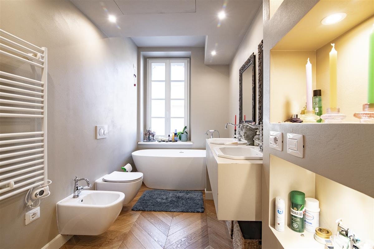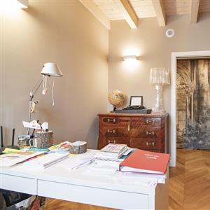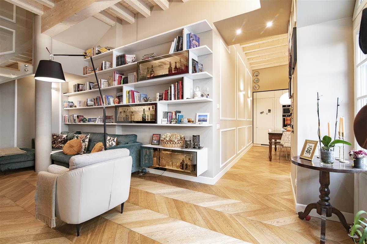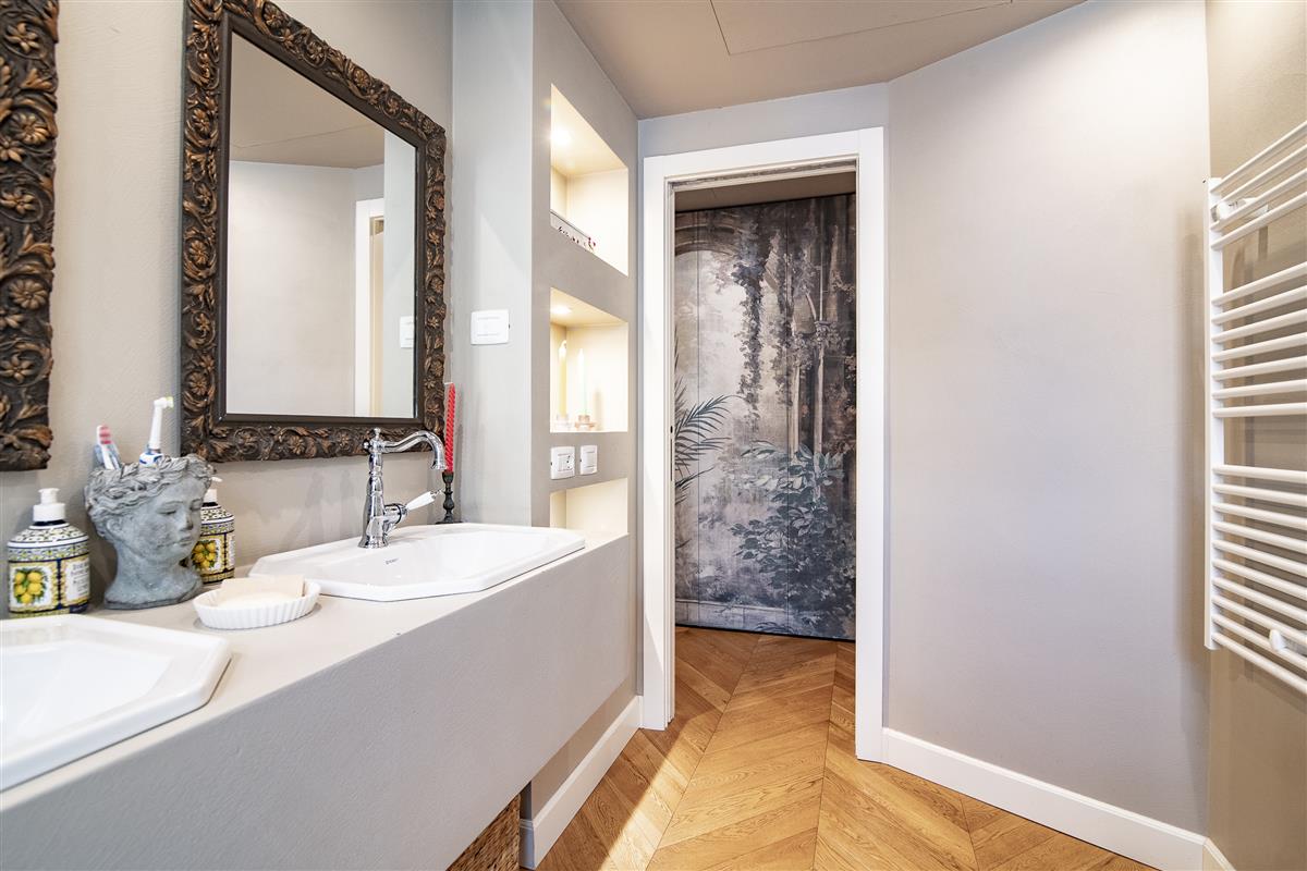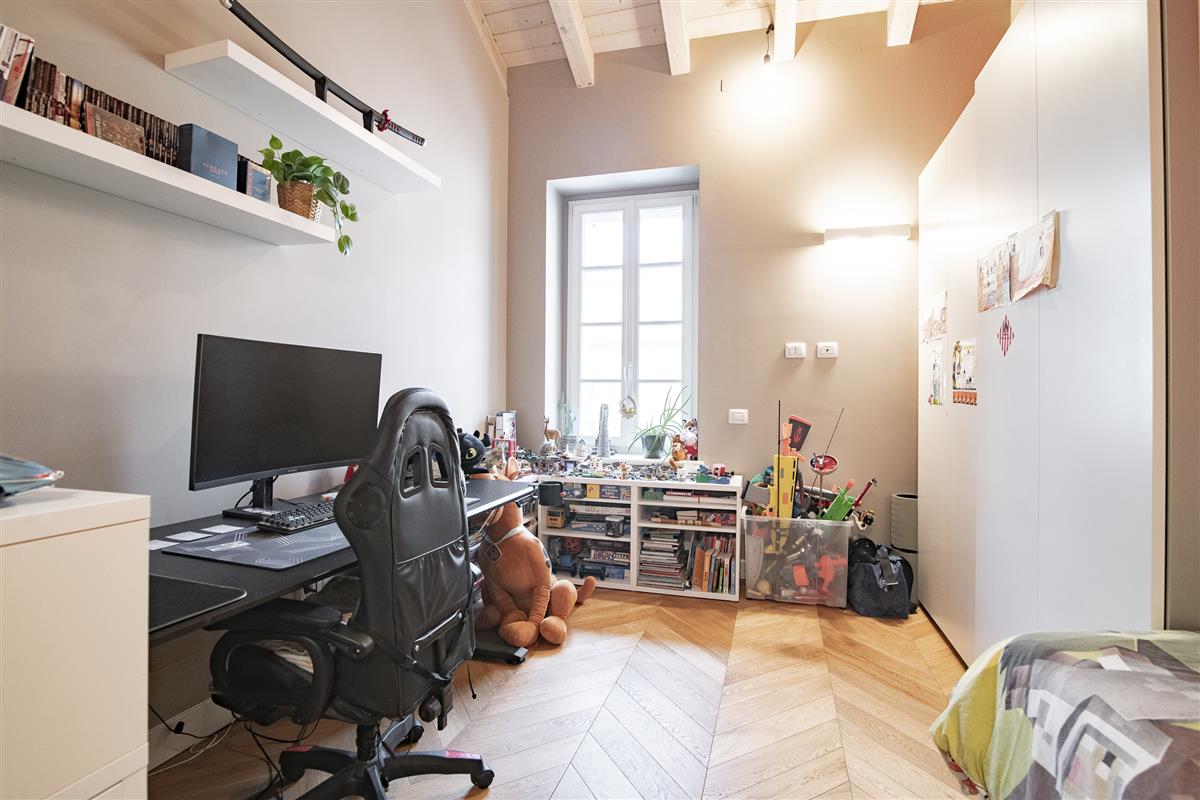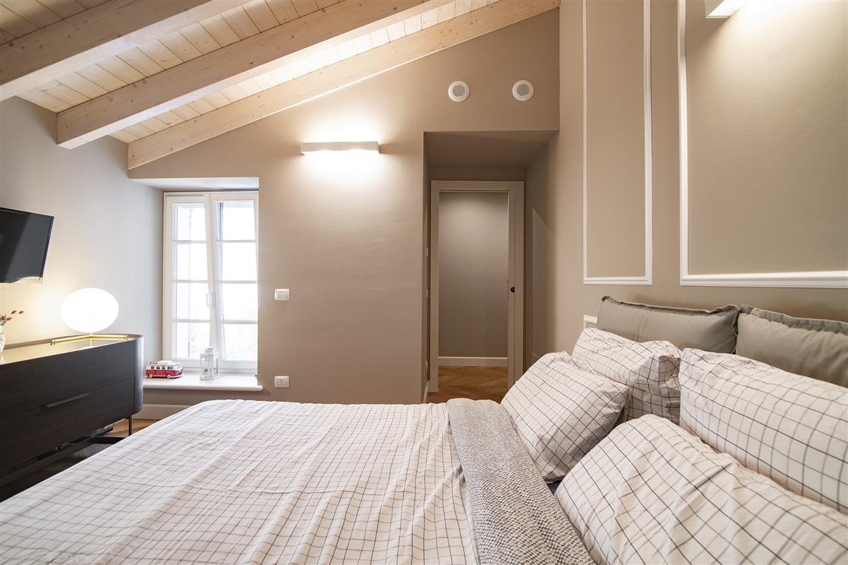 Salendo al piano primo, attraverso una scala con vetrate a tutta altezza, si trova la camera padronale di ampia metratura con cabina armadio, un bagno finestrato con vasca da bagno free standing, una cameretta attualmente adibita a studio, una camera matrimoniale facilmente soppalcabile per ricavare ulteriore superficie.