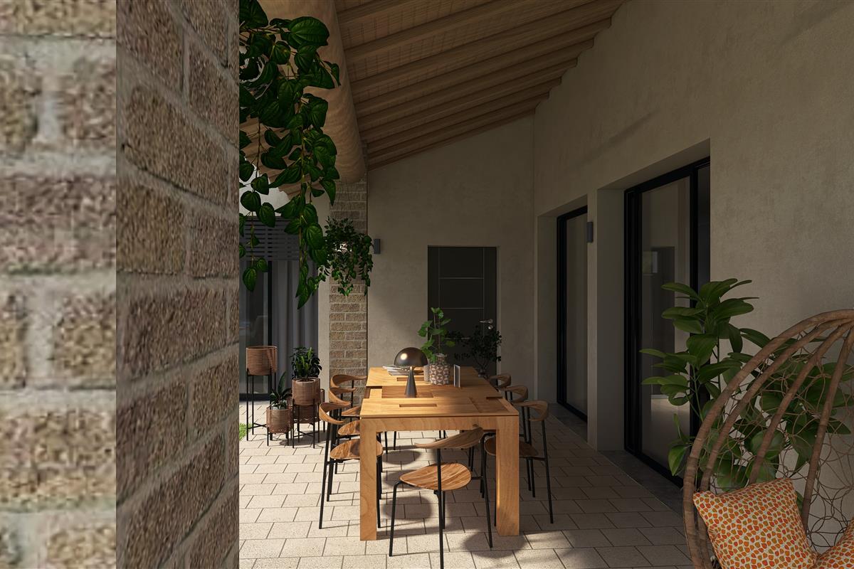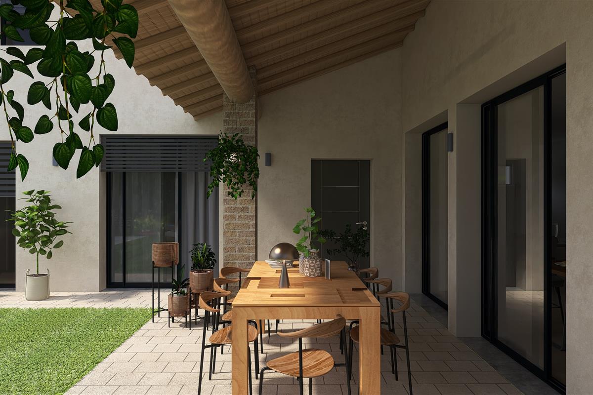 - travi a vista in legno sia nei portici esterni che sulla zona pranzo;